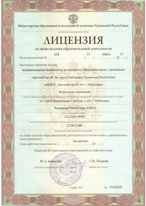 Лицензия на право ведения образовательной деятельности Серия РО № 043569 с 14 марта 2012 года, срок действия бессрочно