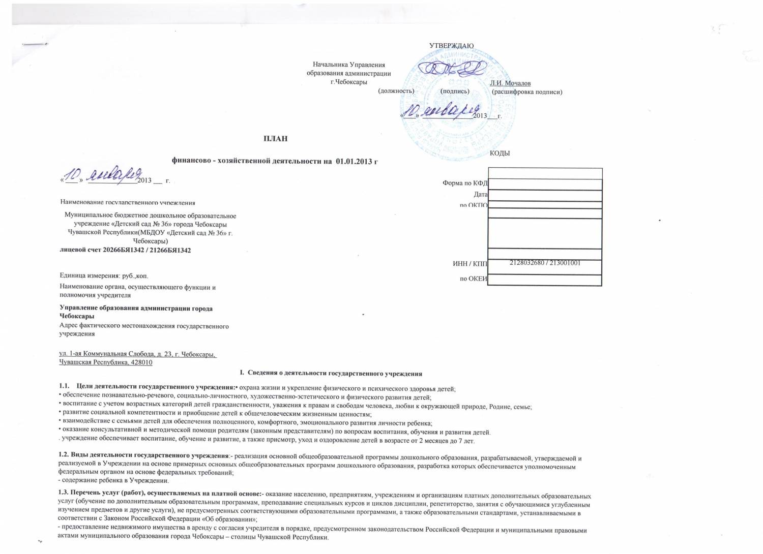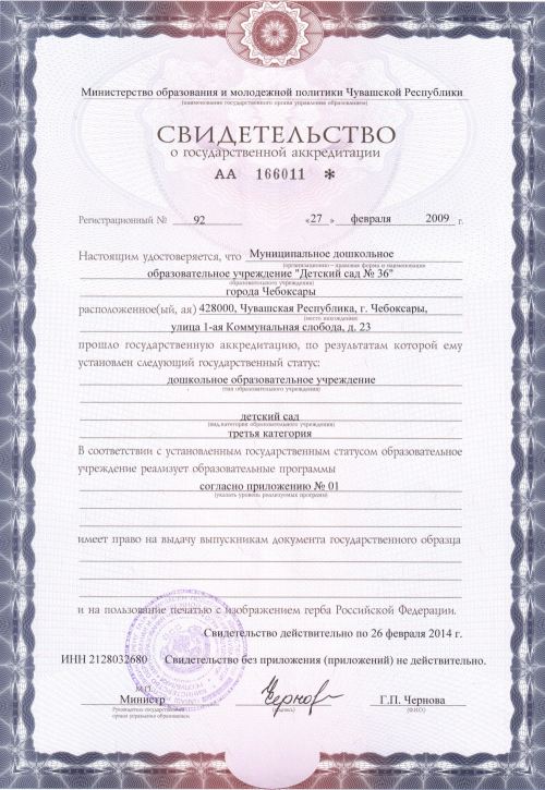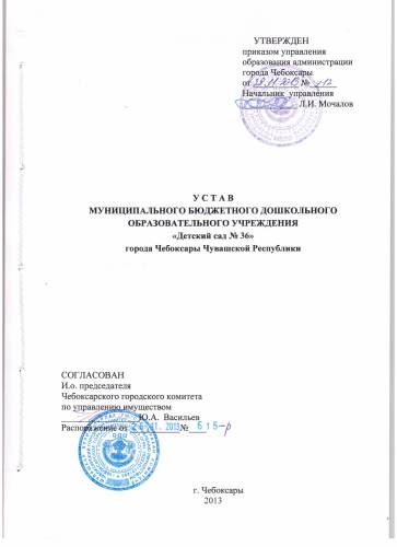 Срок действия от 27 февраля 2009 года по 26 февраля 2014 годаУстав МБДОУ "Детский сад № 36" г.Чебоксары утвержден приказом управления образования администрации города Чебоксары от 28.11.2013года № 912