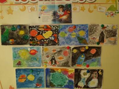 День космонавтики отмечается в России с 1962 года в честь совершенного 12 апреля 1961 года Юрием Алексеевичем Гагариным первого в истории человечества космического путешествия. В связи с этим в старшей группе «Семицветик» велись беседы о Дне космонавтики. Воспитатель Кузнецова Т.Я. рассказывала о космонавтах, космических кораблях. Дети с удовольствием рассматривали иллюстрации с изображением планет. Свои впечатления о космосе они показали на рисунках. Поэтому мы представляем вашему вниманию нашу выставку.