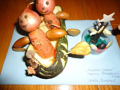 Родители и дети с большим энтузиазмом подхватили идею создания овощных «шедевров». Они проявили свою творчество, умения и фантазию. В ход пошло все: морковь и кабачки, дыни и тыквы, веточки и зубочистки, осенние листья, бумага, ткань, пластилин.