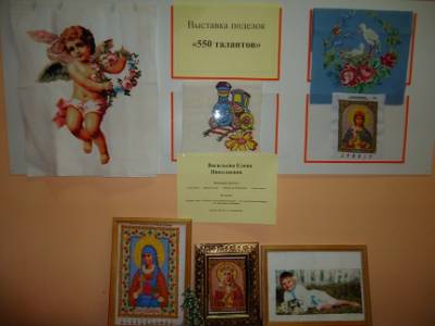 С 24 по 31 марта 2014 года в нашем детском саду прошла выставка «550 талантов». Эта выставка организована в рамках марафона «550 добрых дел». Активное участие приняли сами сотрудники детского сада, родители, а так же и воспитанники. Каких работ тут только не было и у каждого разный способ выполнения своей работы: вязание крючком, вышивание крестом, бисером, выполнение работ в технике оригами и другое.